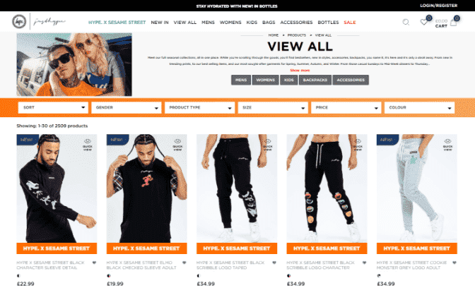 HYPE. is now a lifestyle in which our extensive range can accommodate. Our lines include pretty much everything you can imagine from a fashion brand and more; hoodies, joggers, sweatshirts, t-shirts, vests, polo shirts, coats, parkas, coach jackets, tech jackets, cagoules, shirts, suits and blazers, jeans, chinos, shorts, footwear, ip ops, bucket hats, snap-back caps, 5-panel caps, beanies, bobble hats, skirts, bodysuits, dresses, backpacks, holdalls, bum bags, pencil cases, laptop sleeves, phone cases, and even camping stools and water bottles.